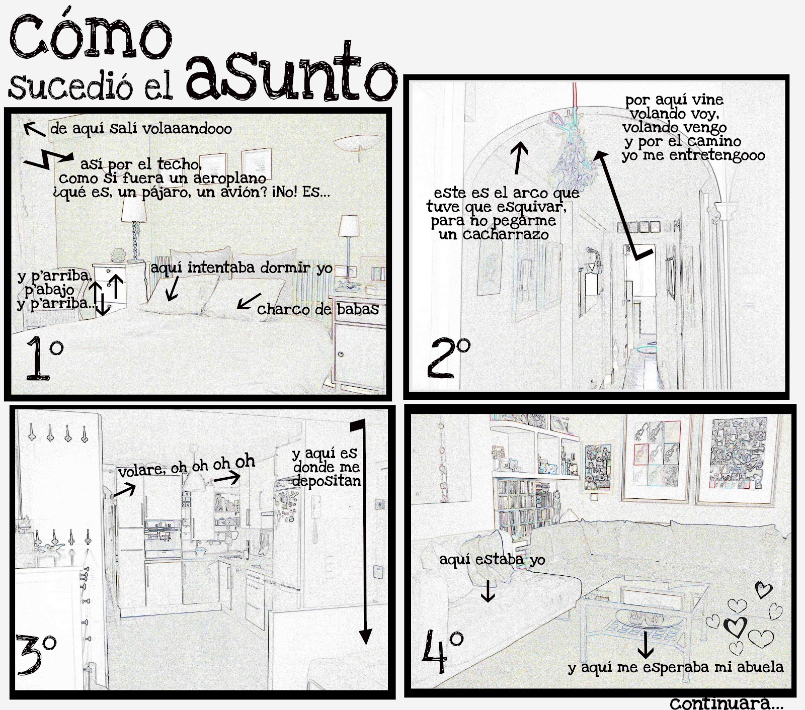 ¿Qué hice entonces? ¿Gritar? En absoluto. Me rendí. Dije: “Está bien. No puedo abrir la ventana y ahora encima quieres que vuele.” Y en ese momento, algo me llevó volando a una velocidad supersónica (bueno, tengo que calcular cuánto es la velocidad supersónica pero fue muy muy rápido) y apenas me dio tiempo a mirar a Mario que seguía durmiendo plácidamente y a agachar la cabeza para no darme con el arco de la puerta. Giré por el aire, crucé a gran velocidad el pasillo y de nuevo casi no me da tiempo a agacharme para esquivar el arco que hay justo en la mitad. Crucé mi cocina y ya al llegar al murete que separa ésta del salón, bajé de velocidad y suavemente me depositó (lo que fuera que me transportaba), despacio en uno de mis sofás… ¿qué podía hacer yo entonces? ¿Me iba a poner a gritar con todo lo que había aguantado ya? Bah. Sólo dije: “Pues vale, muy bien. No puedo dormir, no puedo abrir la ventana… Nada, pues aquí me quedo: en el sofá…”
