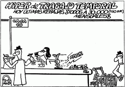 Y luego está María, “la que estaba bien” del grupo, trabajando realmente “de lo suyo”, con un buen sueldo, responsable de sección y con contrato fijo. Por eso nos pilló a todos por sorpresa (sobre todo a ella) que a los dos días de aprobar la reforma laboral la llamaran al despacho del nuevo director, por supuesto al terminar su jornada para entregarle una carta de despido. Disciplinario además. No daba crédito y preguntó casi sin voz que quería decir, que no entendía y el director le dijo que no podía contestarle “que estaba ahí, en los estatutos”. “Abuso de confianza” y “disminución de productividad” habiendo sido una de las pocas sucursales en que esa productividad había aumentado. Ella, haciendo un esfuerzo sobrehumano por no romper a llorar le decía que si él que la estaba despidiendo, no le sabía dar un motivo, ¿entonces quién? Y él se limitó a pedirle que firmara donde decía “recibido y conforme” y María, totalmente noqueada pidió si podía consultarlo con alguien o firmar diciendo que no estaba conforme y le dijo el sinvergüenza que no, que sólo podía firmar. Como para ese momento María ya sí estaba llorando a moco tendido, imaginad la capacidad de raciocinio que le quedaba y… firmó. Le dijeron que era de efecto inmediato, que “mañana ya no se presentara a trabajar”. Otro punto y final.